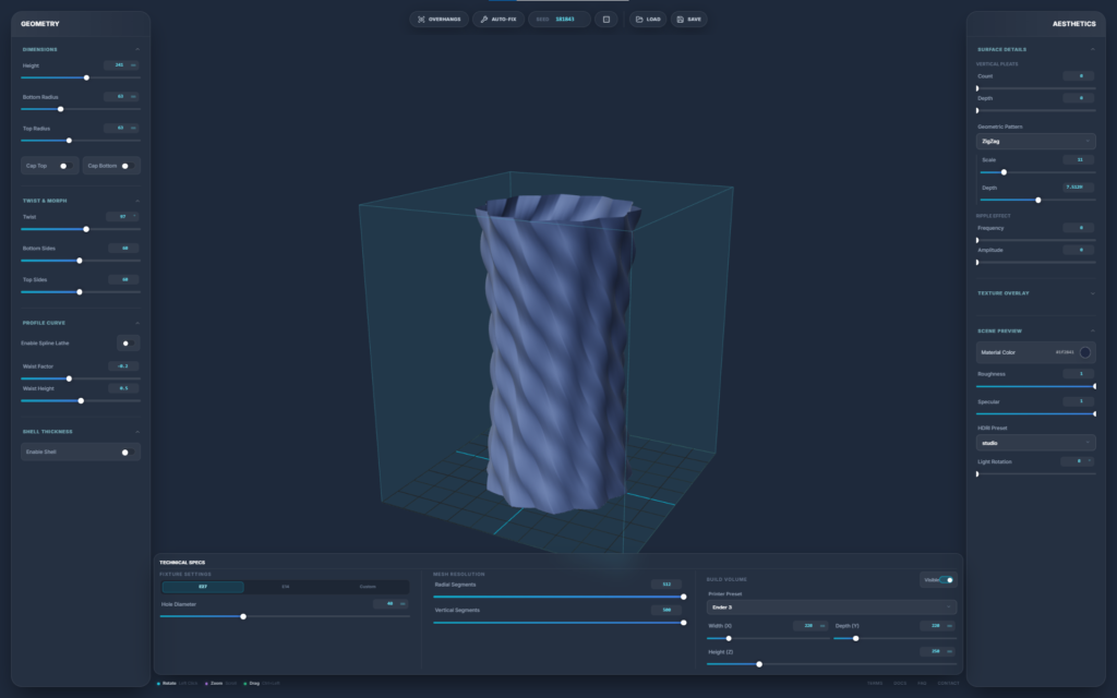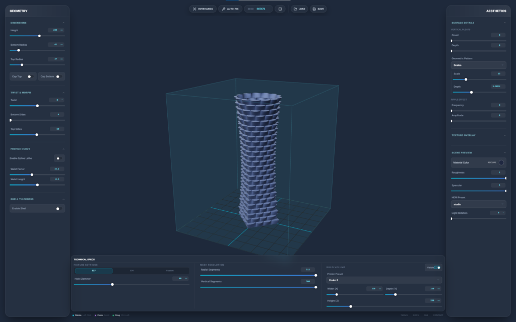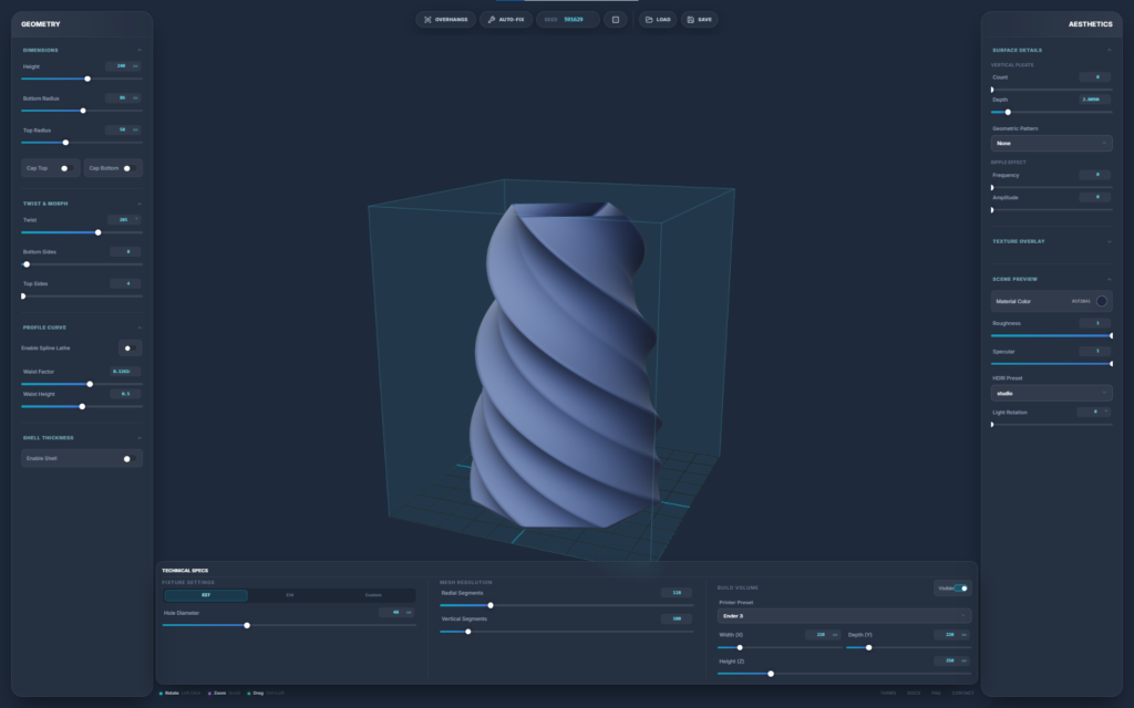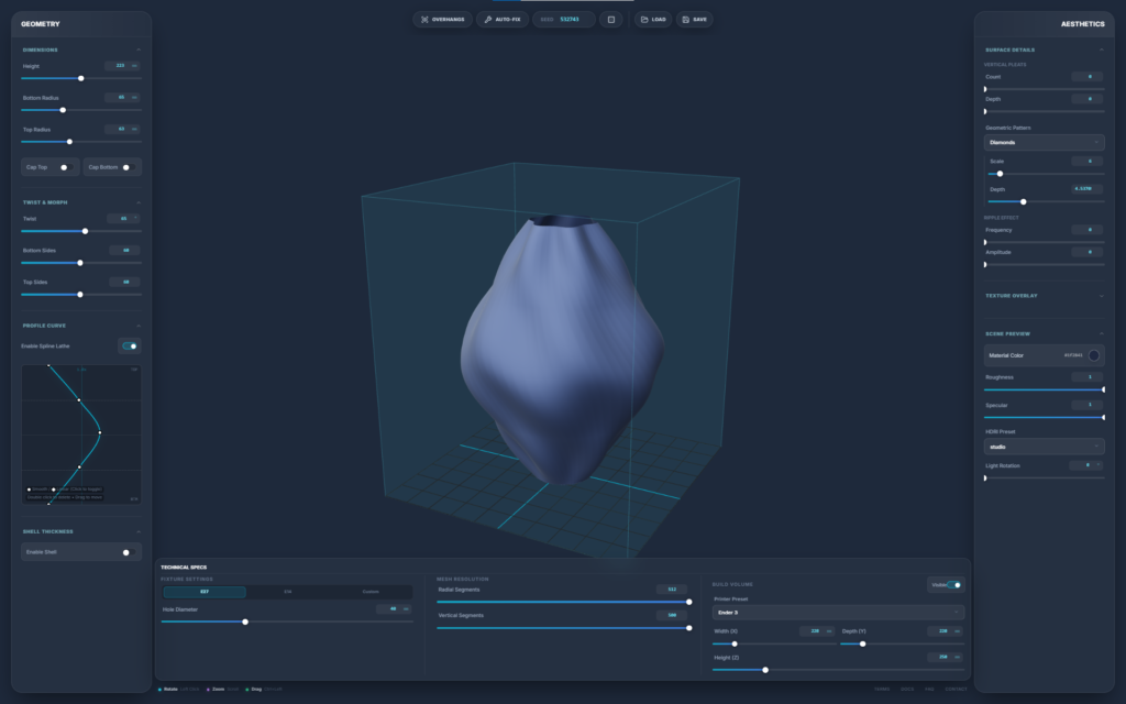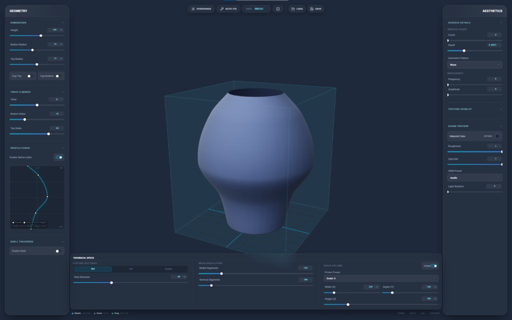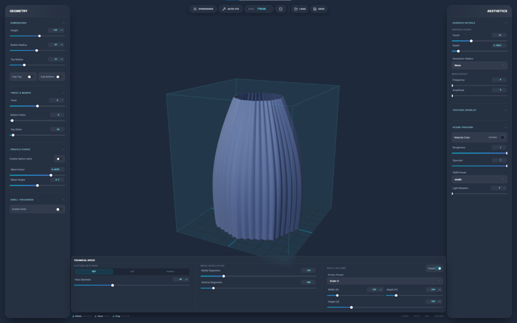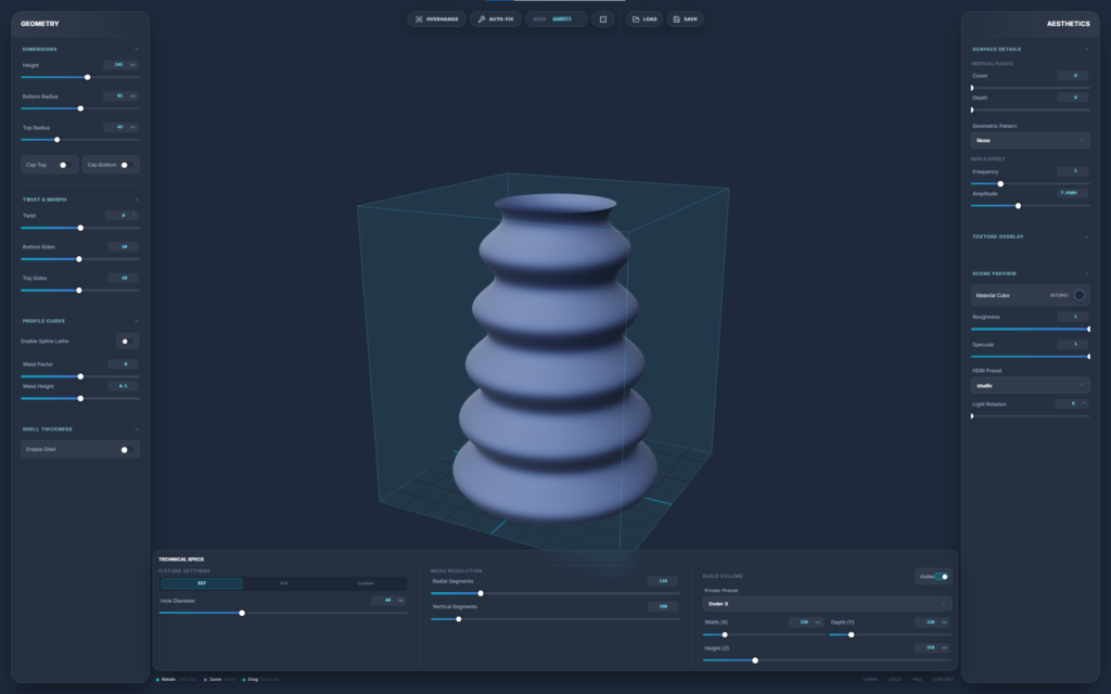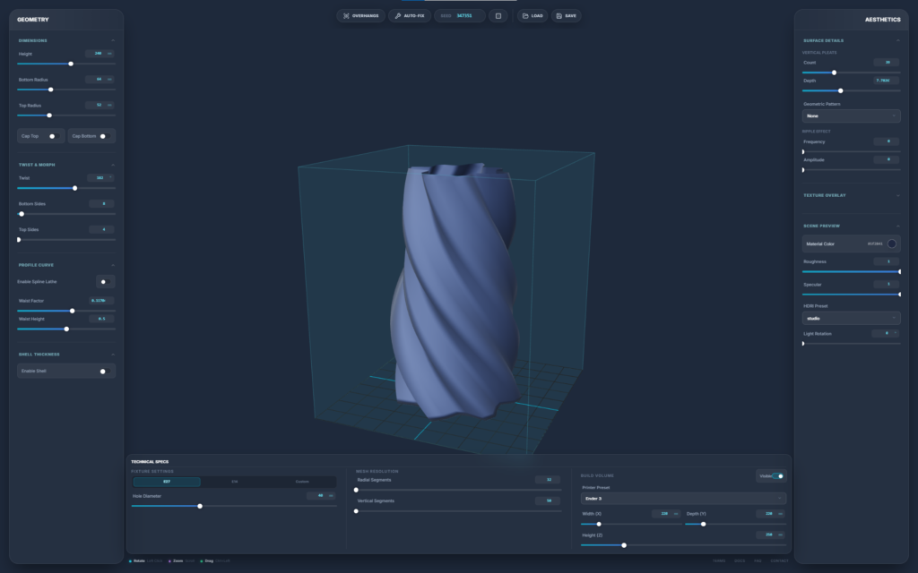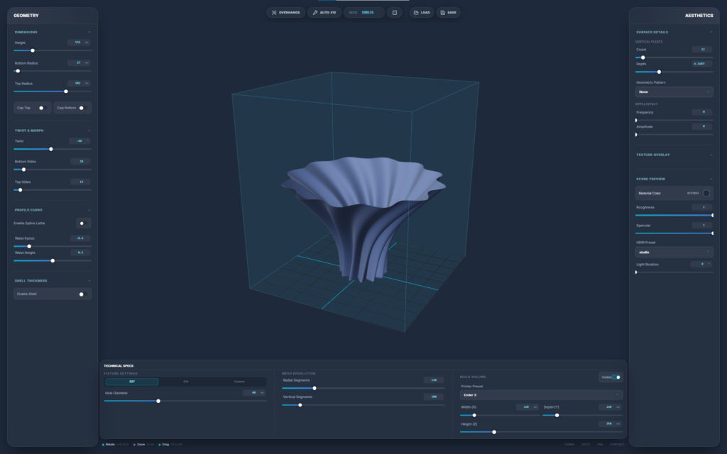 A browser-based parametric 3D design engine built specifically for 3D printing. It strips away the bloat and steep learning curve of traditional CAD software, allowing you to generate complex, production-ready geometries—such as lamps and vases—through a fast, slider-driven interface. It bridges the gap between algorithmic design and FDM manufacturing in a single, isolated web environment